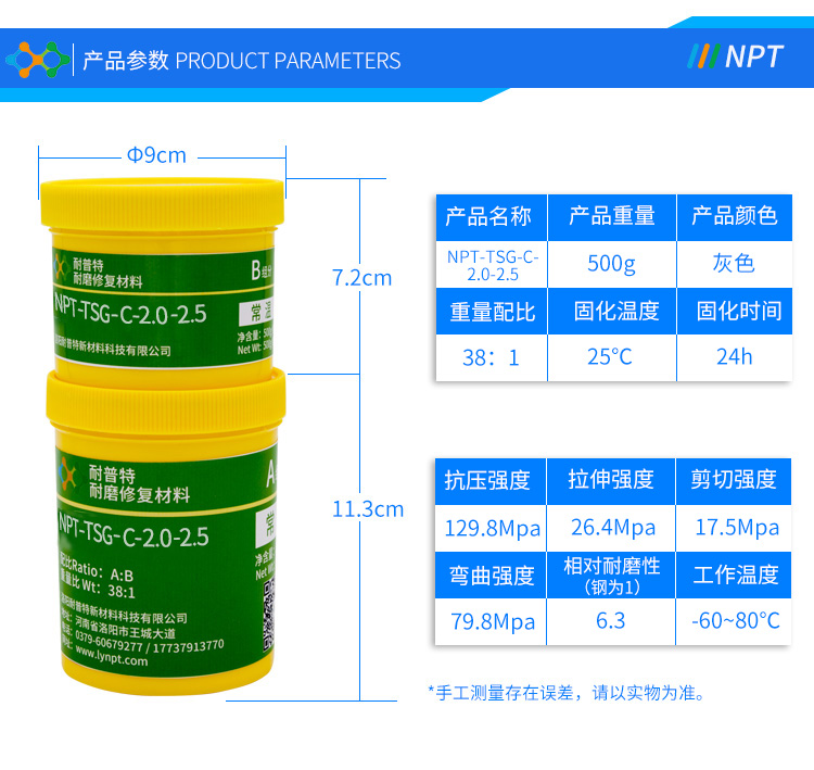 双组分,以陶瓷、金属碳化物、微型颗粒为骨材的耐磨复合材料,具有耐水、耐油、耐酸碱性。适用(-60℃-250℃)设备过流冲蚀、设备的大面积修复、设备预涂耐磨层,如旋流器、浮选柱、浮选机、泡沫槽、分级机、搅拌桶、溜槽、管件类、泵类等修复。